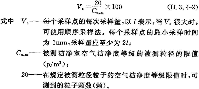 D.4.1 潔凈廠房性能測試認證前,應(yīng)由業(yè)主與認證單位簽訂協(xié)議書,協(xié)議書中應(yīng)明確檢測項目、測點位置及數(shù)量、測量要求和限值等,如測量空氣懸浮粒子濃度采樣點數(shù)、每次最少的空氣采樣量、采樣時間、每個采樣點的測量次數(shù)、測量時間間隔、被計數(shù)粒子的粒徑,以及粒子數(shù)的限值等。